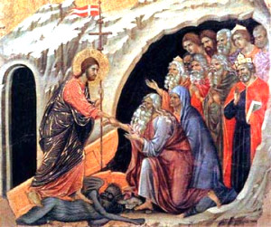 ক্রুশ জয়ধ্বজা হিসাবে ধ'রে মৃত্যুঞ্জয়ী যিশু পাতাল-বন্দিদের উদ্ধার করেন। তাঁদের মধ্যে রয়েছেন আদম, হবা, দাউদ রাজা ইত্যাদি ব্যক্তিত্ব। |